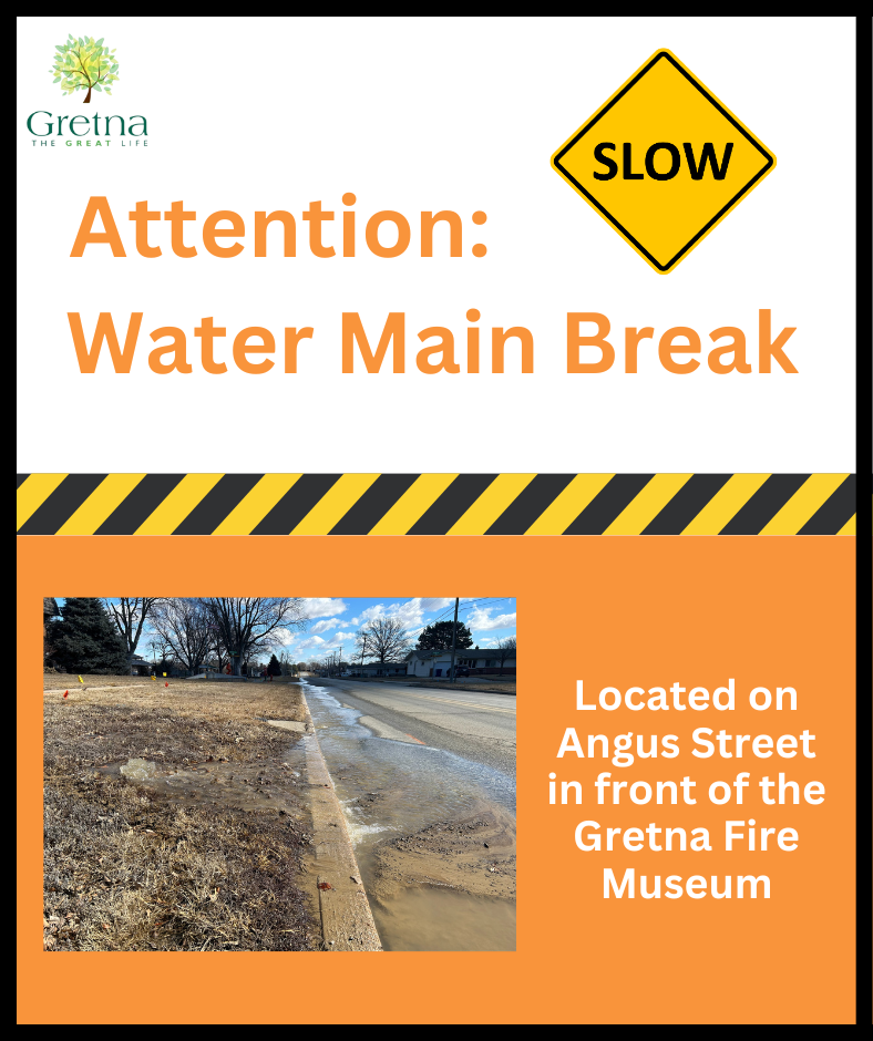 Please use caution when driving or walking on Angus Street due to a water main break in front of the Gretna Fire Museum. Once digging begins, traffic will be reduced to one lane but will reopen to two lanes as soon as work allows. Our Public Works Department is on-site and working to resolve the issue as quickly as possible. If you have any questions or concerns, please contact City Hall!