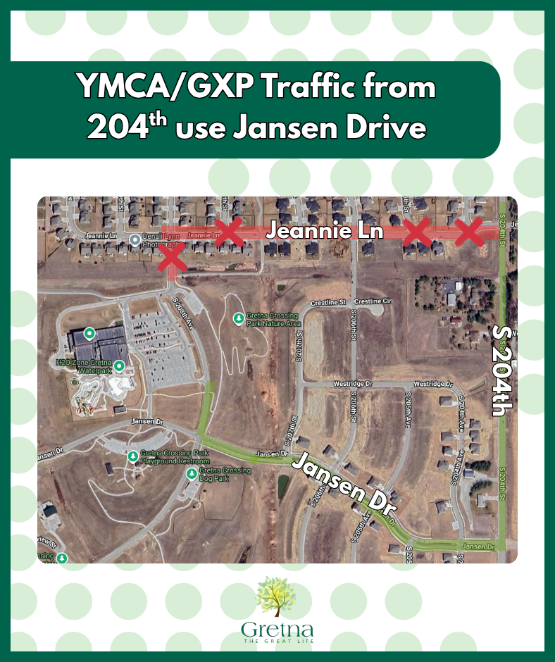 We’ve received an increase in calls from residents in the Lakeview neighborhood about traffic concerns. To help keep the area safe, all visitors heading to Gretna Crossing Park or the Gretna Crossing YMCA are to avoid using Jeannie Lane.