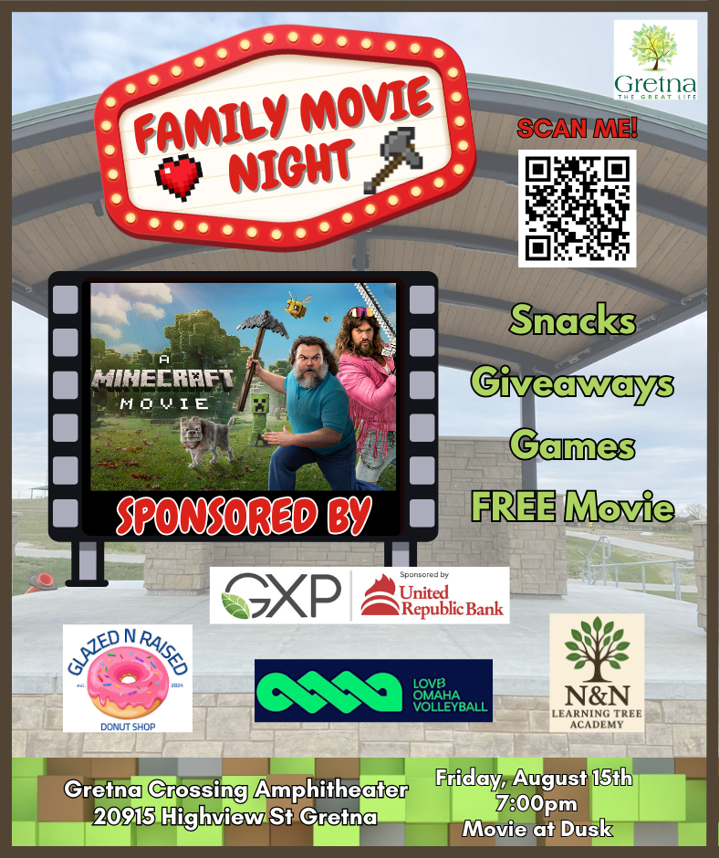 Join the City of Gretna and United Republic Bank for our 2nd Annual Family Movie Night under the stars at the Gretna Crossing Amphitheater!