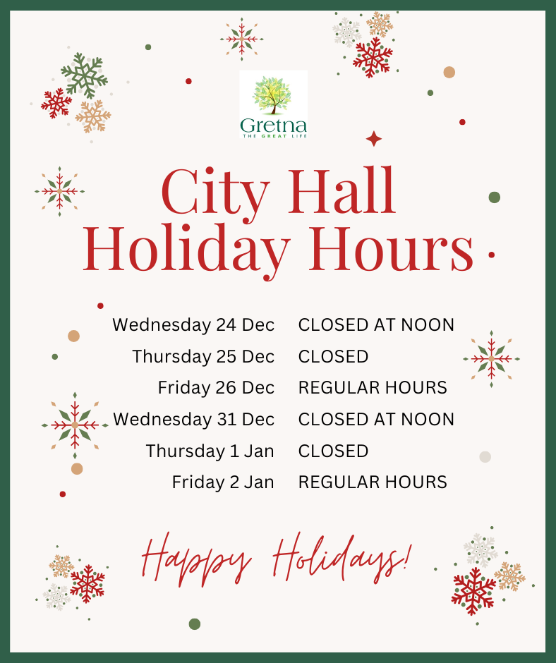 City Hall will have adjusted hours during the holiday season. If you have any questions, please contact us at 402-332-3336.