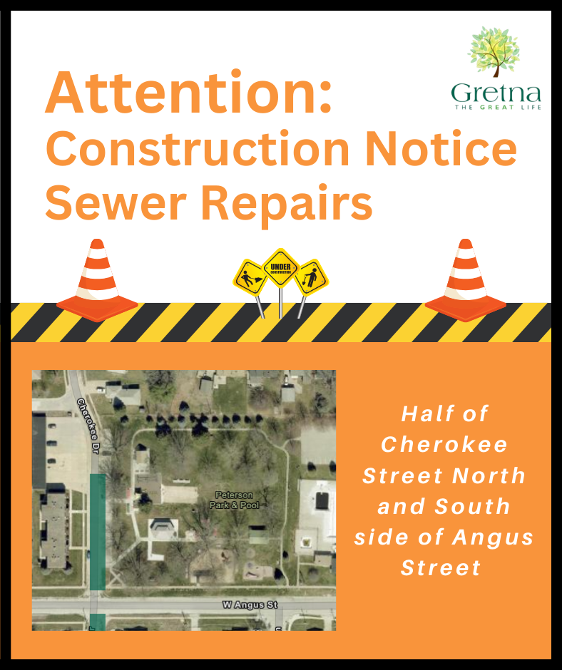 LN & L Contractors will be doing sewer repairs on Cherokee Street across from Peterson Park. Cherokee Street will be half closed at Angus St going North but will allow resident apartment users and Peterson Park users, to access parking lots on the South side of Peterson Park. After those repairs, the contractor will move South across Angus St for further repairs near the intersection. The project is anticipated to take 3-4 weeks. Thank you for understanding!