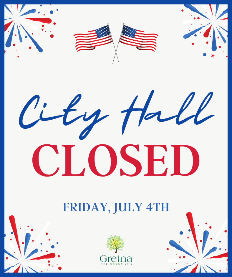 Gretna City Hall is closed on Friday, July 4th in honor of Independence Day. Have a safe and fun holiday, we will be back to normal hours on Monday!